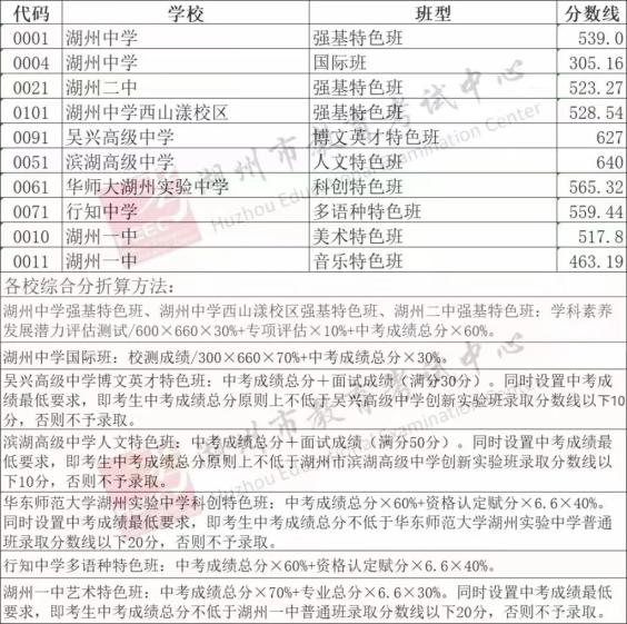 01湖州中学特色班:中考成绩×50%+校测成绩×6.3×50%。