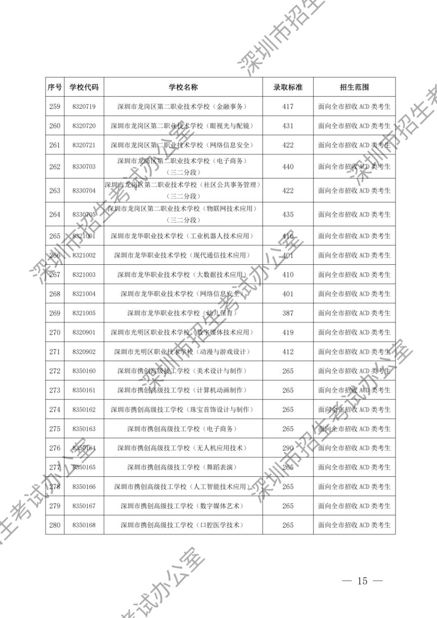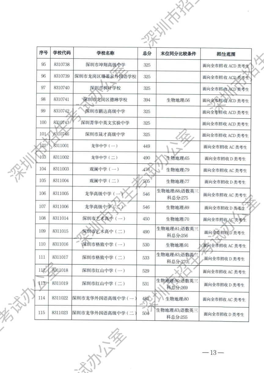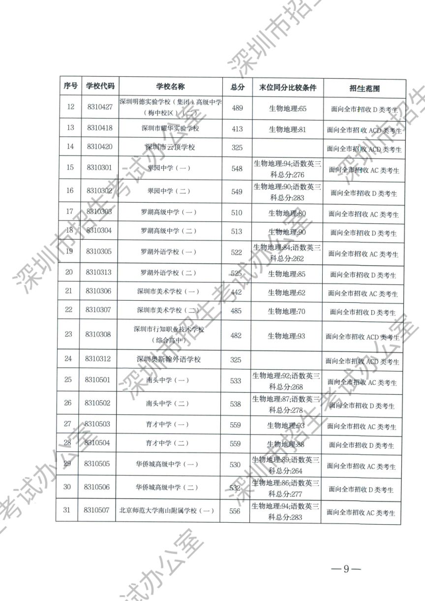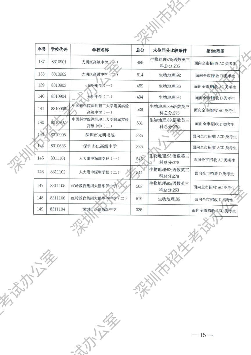 深圳市2023年高中阶段学校第一批、第二批录取标准